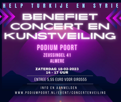 Zaterdag 18 februari 2023 wordt er in Almere bij Podium Poort een benefietconcert gegeven met Art veiling, waar ook mijn werk te veilen is. De gehele opbrengst komt ten goede aan giro555 voor de slachtoffers van de aardbeving in Turkije en Syrie. U bent van harte welkom.De stukken die niet geveild worden ter plekke worden vanaf volgende week via social media geveild.